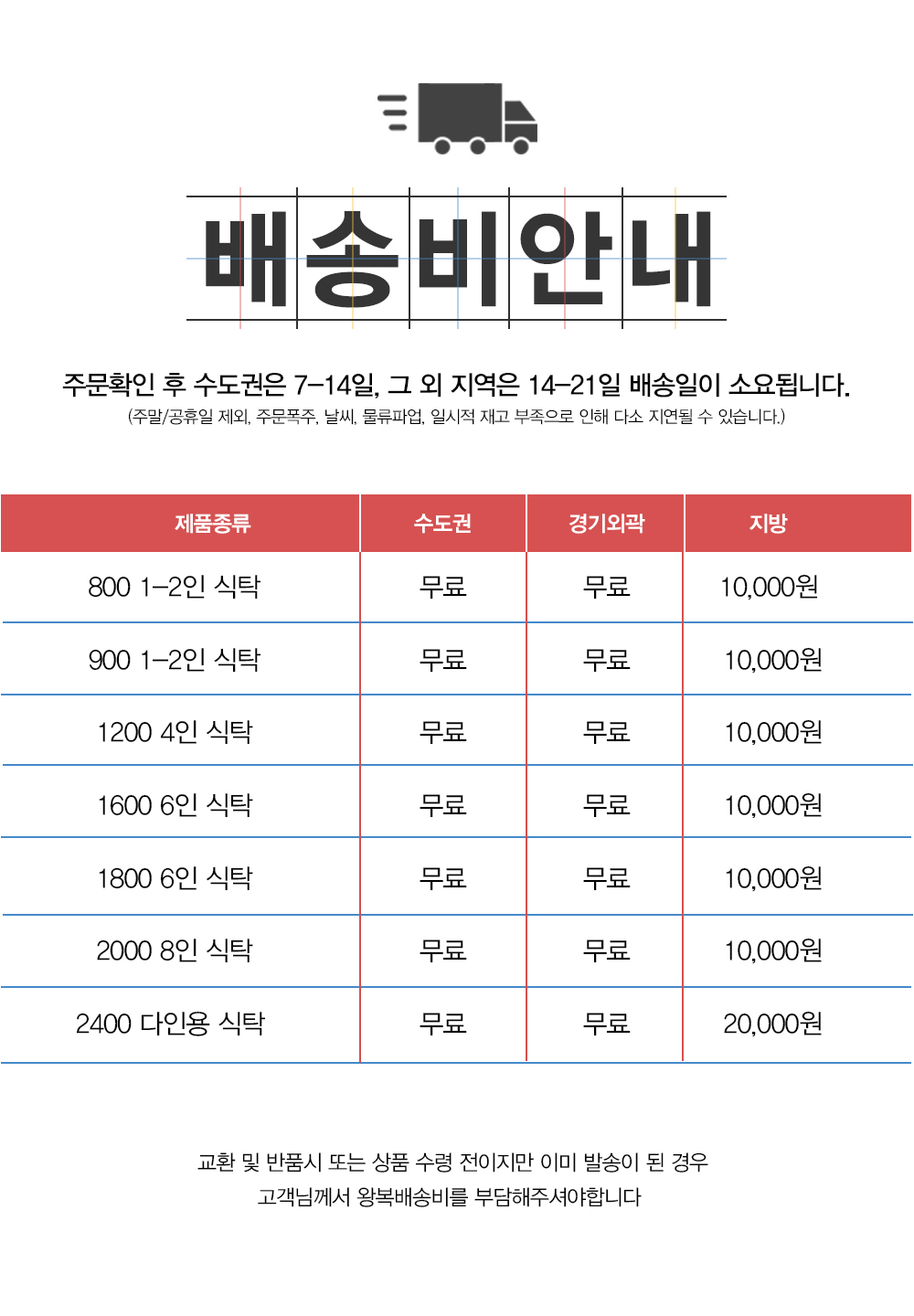 - 배송기간 제품, 지역별 상이(약 10일~15일)